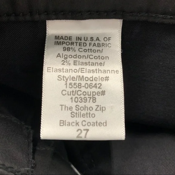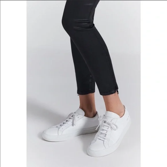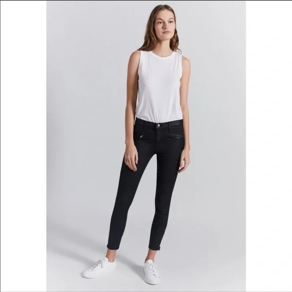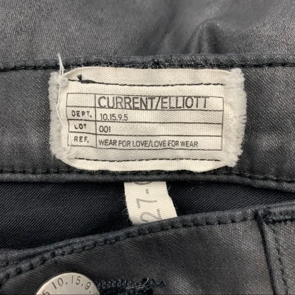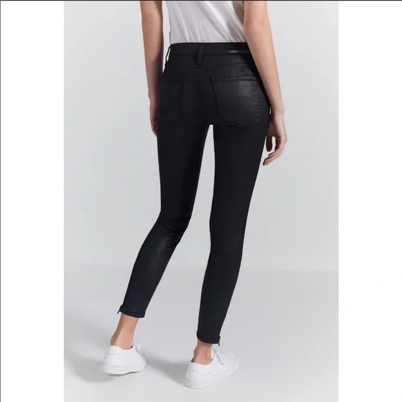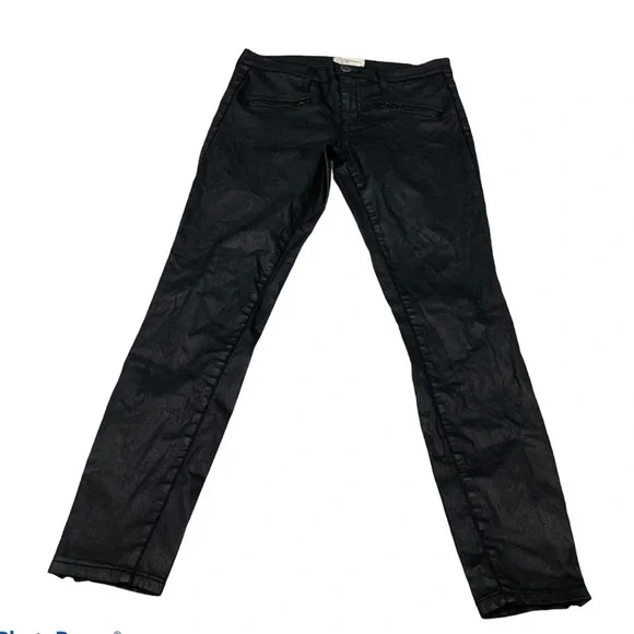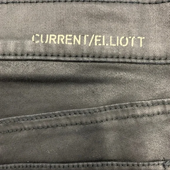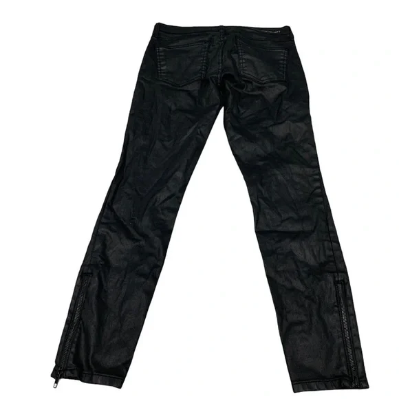 One pair of punk designer skinny shaping liquid oiled black coated leather faux stretch comfort fitted skinny ankle zipper rock star pants jeans by Current Elliot in a women's size 27. Good condition with some slight fading of logo on back (pictured). Inseam measures approximately 27.5 inches and rise measures approximately 9 inches. c2Offers welcome, thanks for shopping my page!