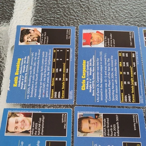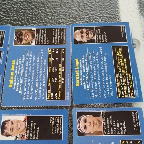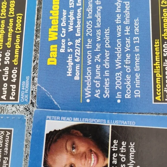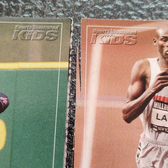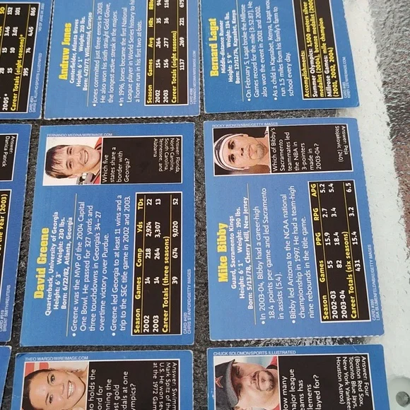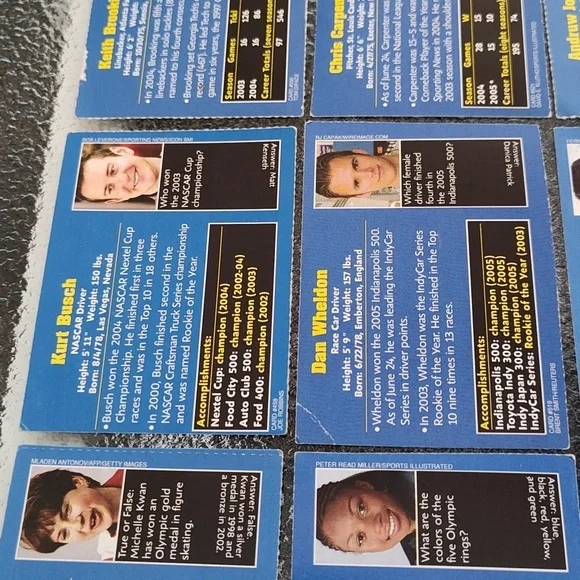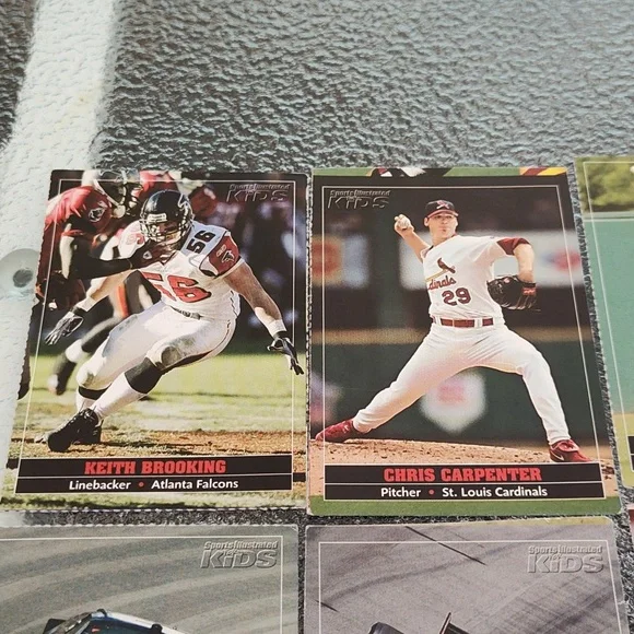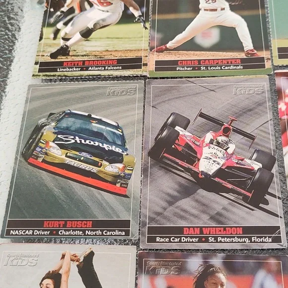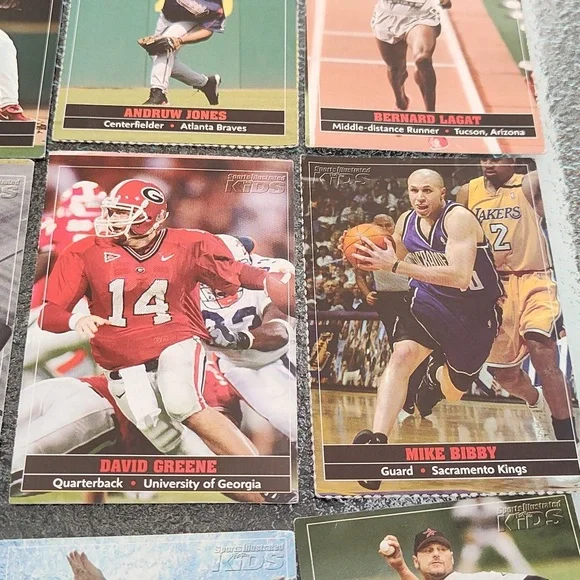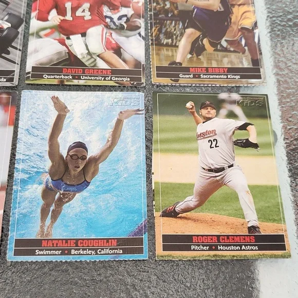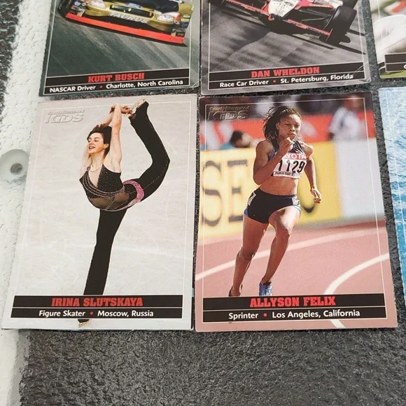 Bag #19Keith Brooking - Football - Atlanta Falcons - NFLChris Carpenter - Baseball - St. Louis Cardinals - MLBAndruw Jones - Baseball - Atlanta Braves - MLBBernard Lagat - Middle-Distance RunnerKurt Busch - Race Car Driver - NASCAR DriverDan Wheldon - Race Car Driver - Formula OneDavid Greene - College Football - University of GeorgiaMike Bibby - Basketball - Sacramento Kings - NBAIrina Slutskaya - Figure SkaterAllyson Felix - SprinterNatalie Coughlin - SwimmerRoger Clemens - Baseball - Houston Astros - MLBSports Illustrated Kids Trading Cards - Set of 12 - GUCA dozen trading cards in good, used condition!Please check photos carefully before purchasing. Athletes listed above and photographed are the cards you will be receiving. Packs are for sale as is. These are great for the collector or sports enthusiast in your life! *Ships from NY! Pet-free, smoke-free home! Will consider reasonable offers! *Comment with any questions! Please ask all questions prior to purchasing. ALL SALES ARE FINAL. Please read this listing carefully and check the photos. I want you to love your purchase! 3/24Drawer #3